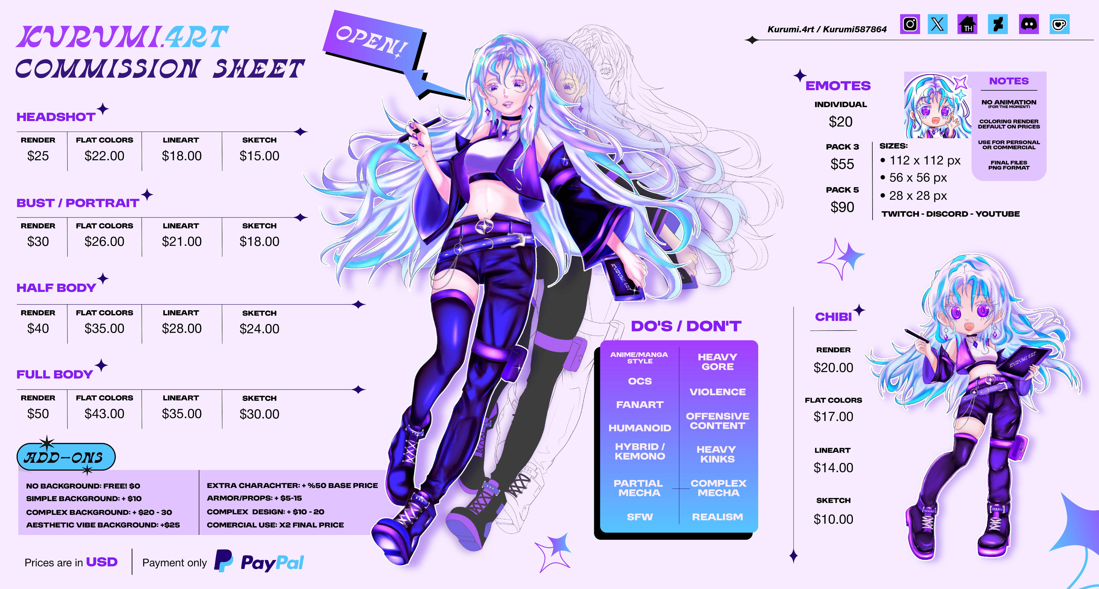 ◆ All prices are in USD ($) and paid via PayPal Invoice or Kofi commissions or Vgen Commissions◆ Full payment upfront after commission approval.◆ Work begins only after payment is received.◆ Extra charges apply for:• Backgrounds: